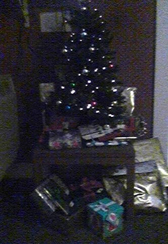 After the sleigh ride we returned to the cabin where J started a roaring fire while I made dinner for two. Once we finished dinner, we decorated our tree and then stood back to admire our efforts.
