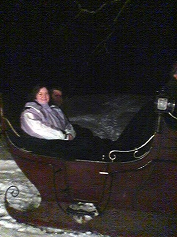 J and I rode in the sleigh (an antique specimen over 100 years old) through the dark woods warmed under the heavy sleigh blanket draped across our bodies. The only illumination as we glided over the snow was the soft glowing light of the sleigh lamp and the moonlight reflected off the snow and lightly falling rain. The woods were quiet except for the delicate ringing of the sleigh bells and the movement of the horses. There was a misty fog all around us that further limited our view as the horses pulled us along the trail. It was breathtaking and magical and as my husband held my hands in his I took in the beauty of the moment and felt the tears welling up just before they spilled over onto my cheeks. I will never forget the experience and I am so grateful to have had the chance to go on the special ride.