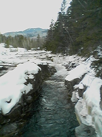 The icy river underneath the bridge.